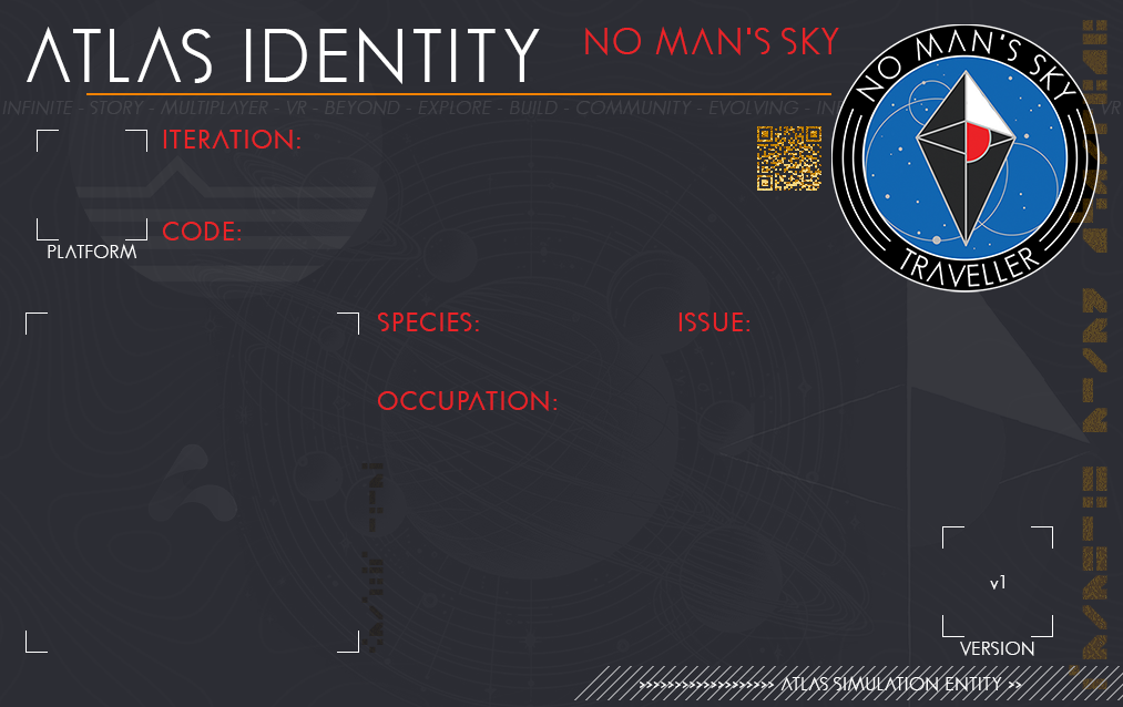 Based on the "Galactic Atlas Explorer" ID card series (v1, option) from by u/zoniko, the Atlas Identity Card is wallet sized, when printed at 300dpi. I left the corners square to simplify editing for most interlopers. The main purpose of such cards is to provide a fun way to share your NMS friend code in places like the NMS Glyph Exchange Discord #-friend-code-exchange channel, or to other Travellers in Civilized Space.
